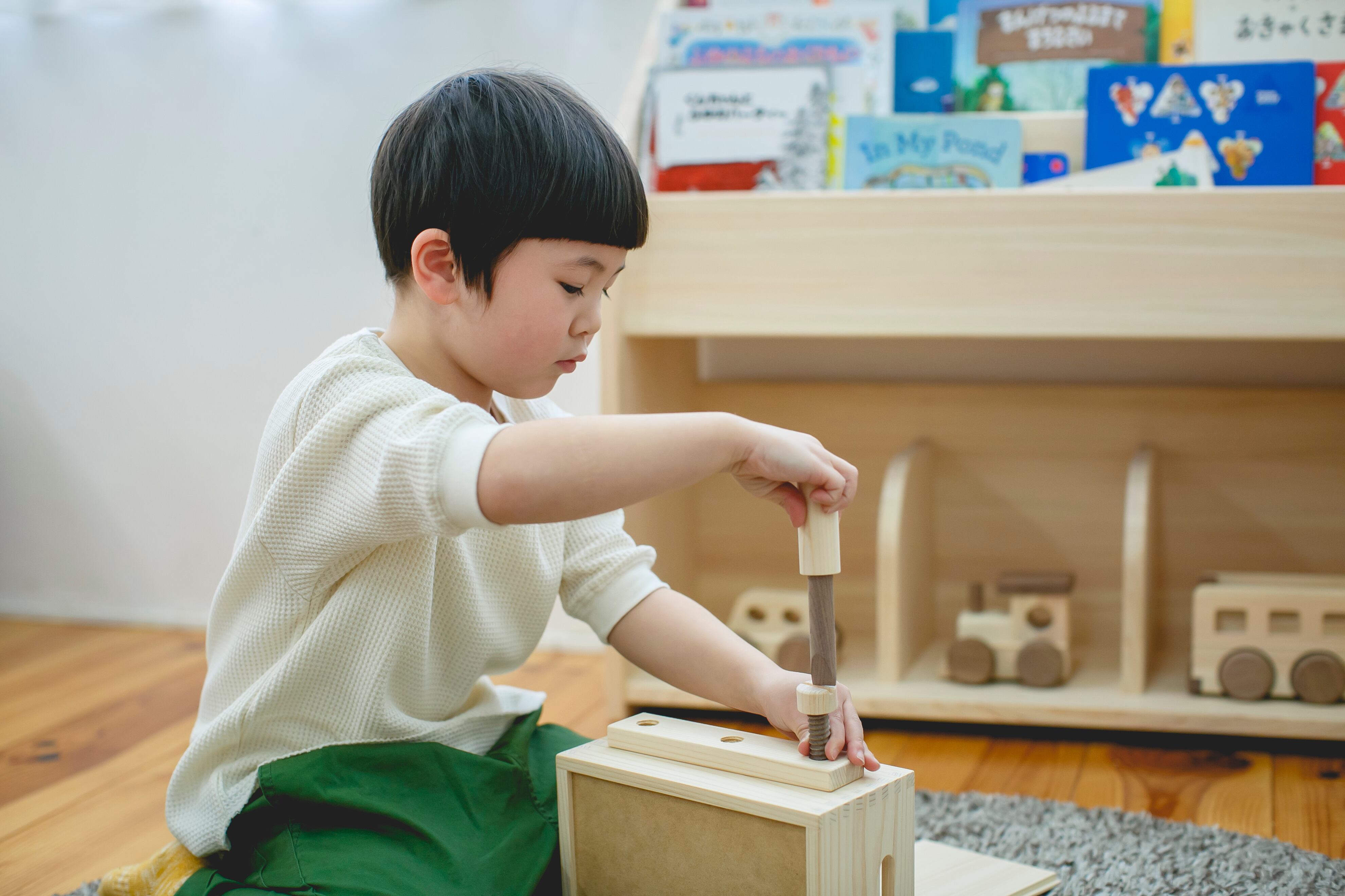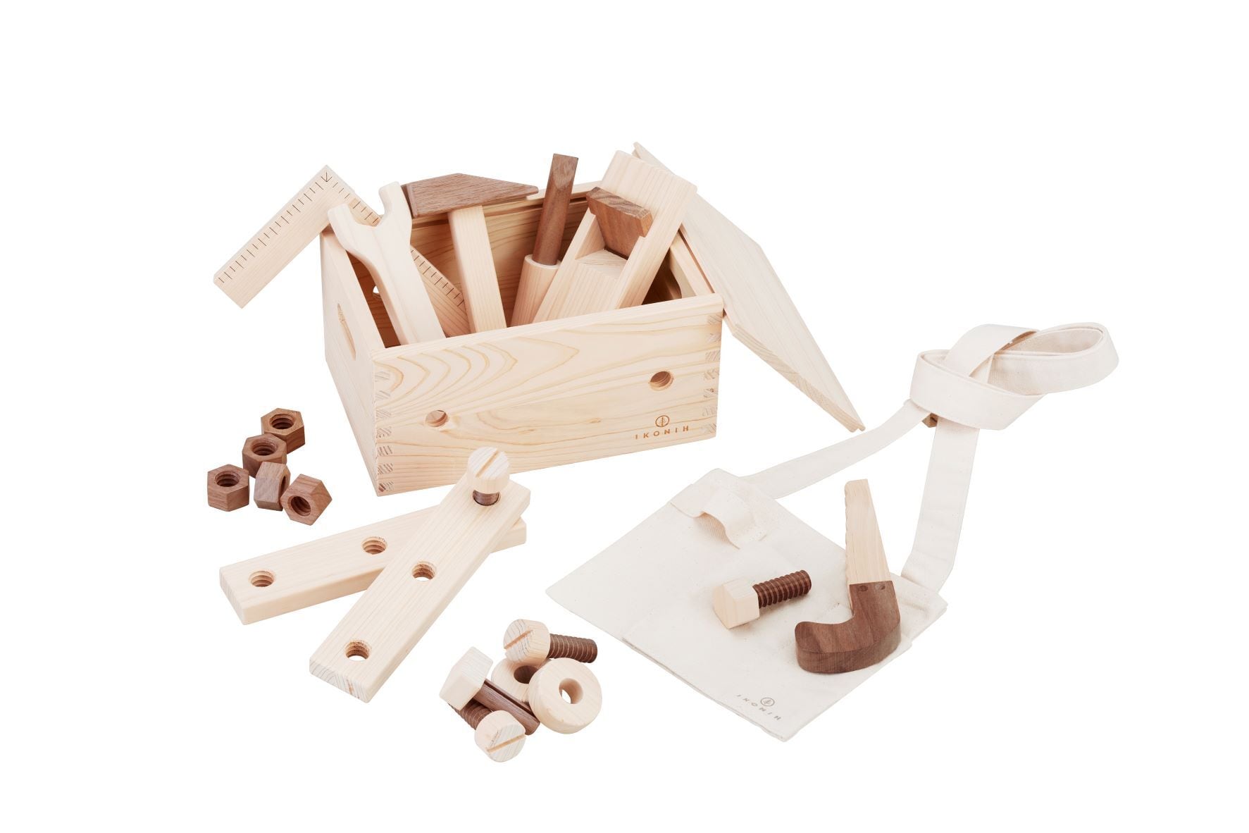 本物そっくりの工具が登場しました。たたいたり、回したり、つかんだりと色々な遊びに使えます。外箱は工具箱になっています。付属の穴付き棒に、箱をねじで通せば、取っ手付きのお道具箱になります。一つずつ丁寧に『無塗装』で仕上げており、お子様の口に入れても安全です。