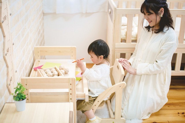 子どもの成長に合わせて高さが5段階変えられる、ひのきの机です。